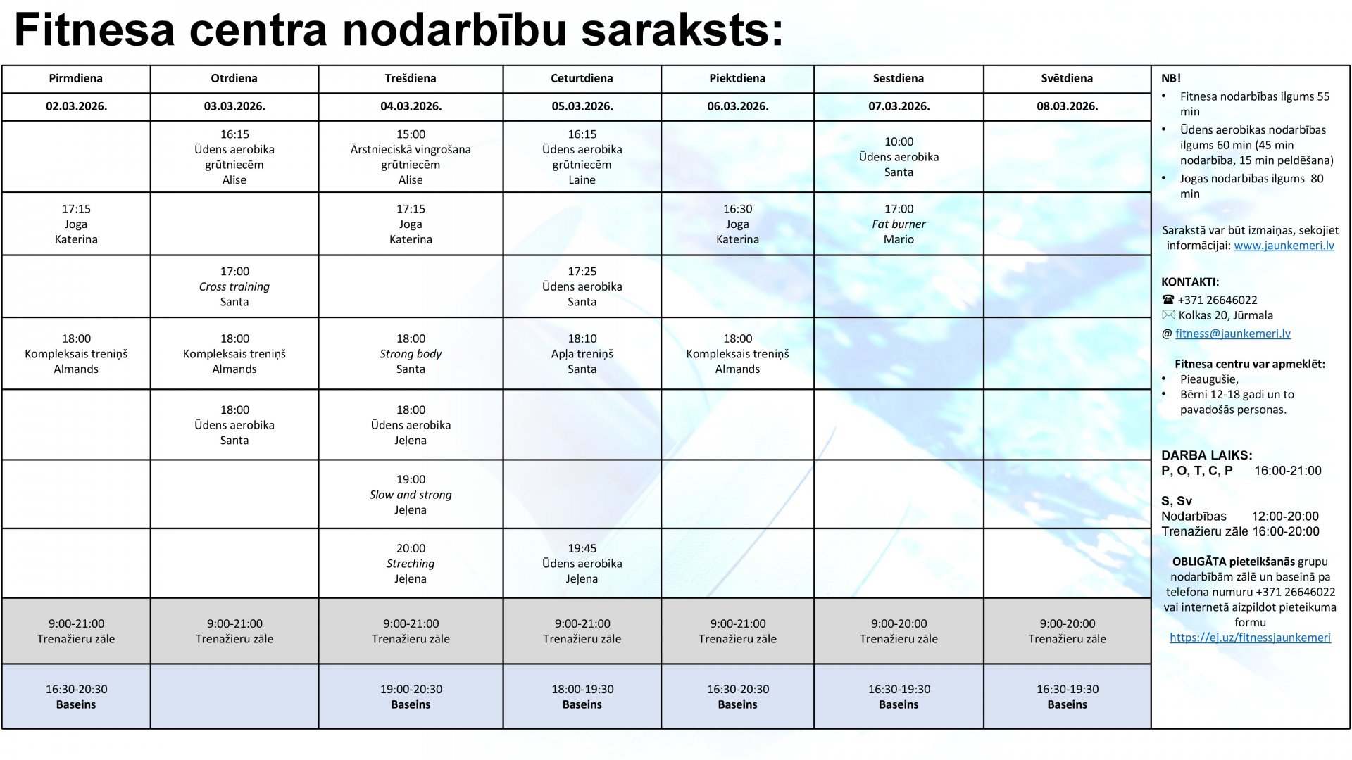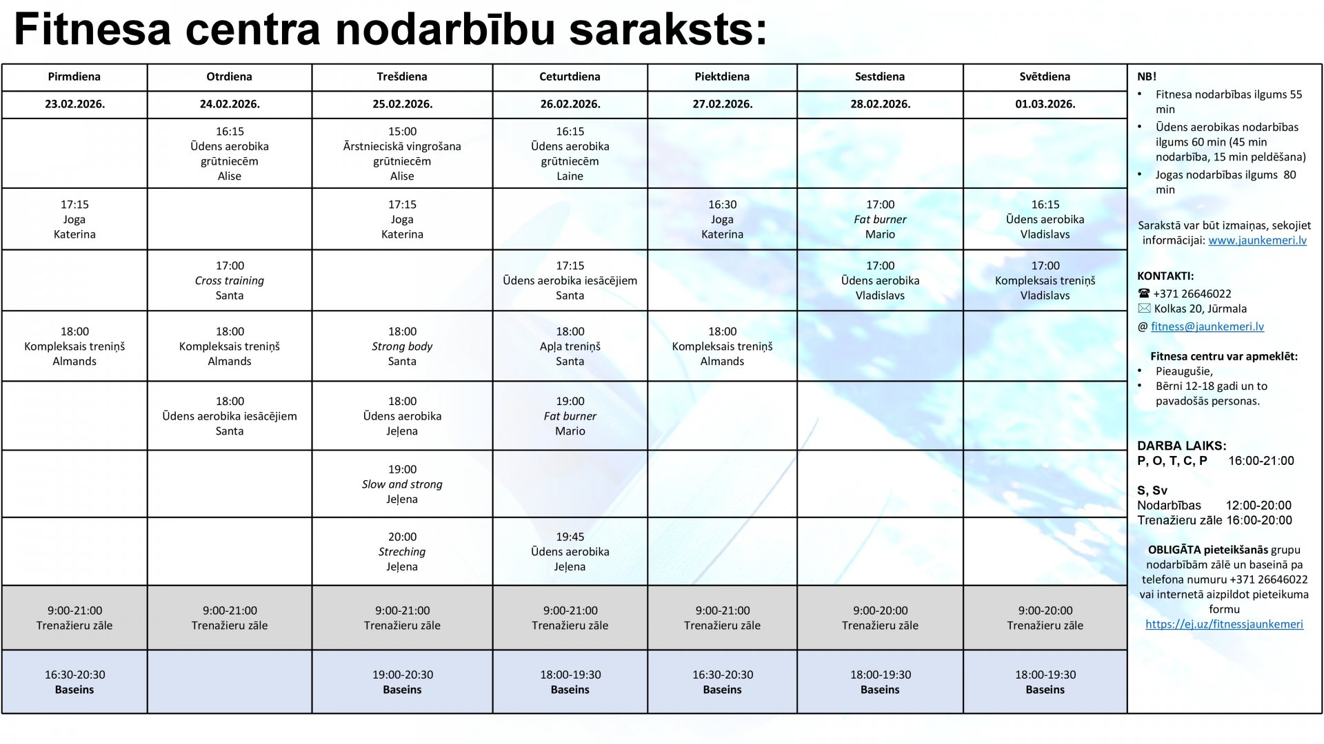 Uzmanību! Lai apmeklētu Fitnesa centra nodarbības, lūdzam aizpildīt pieteikšanās anketu internetā: https://ej.uz/fitnessjaunkemeri