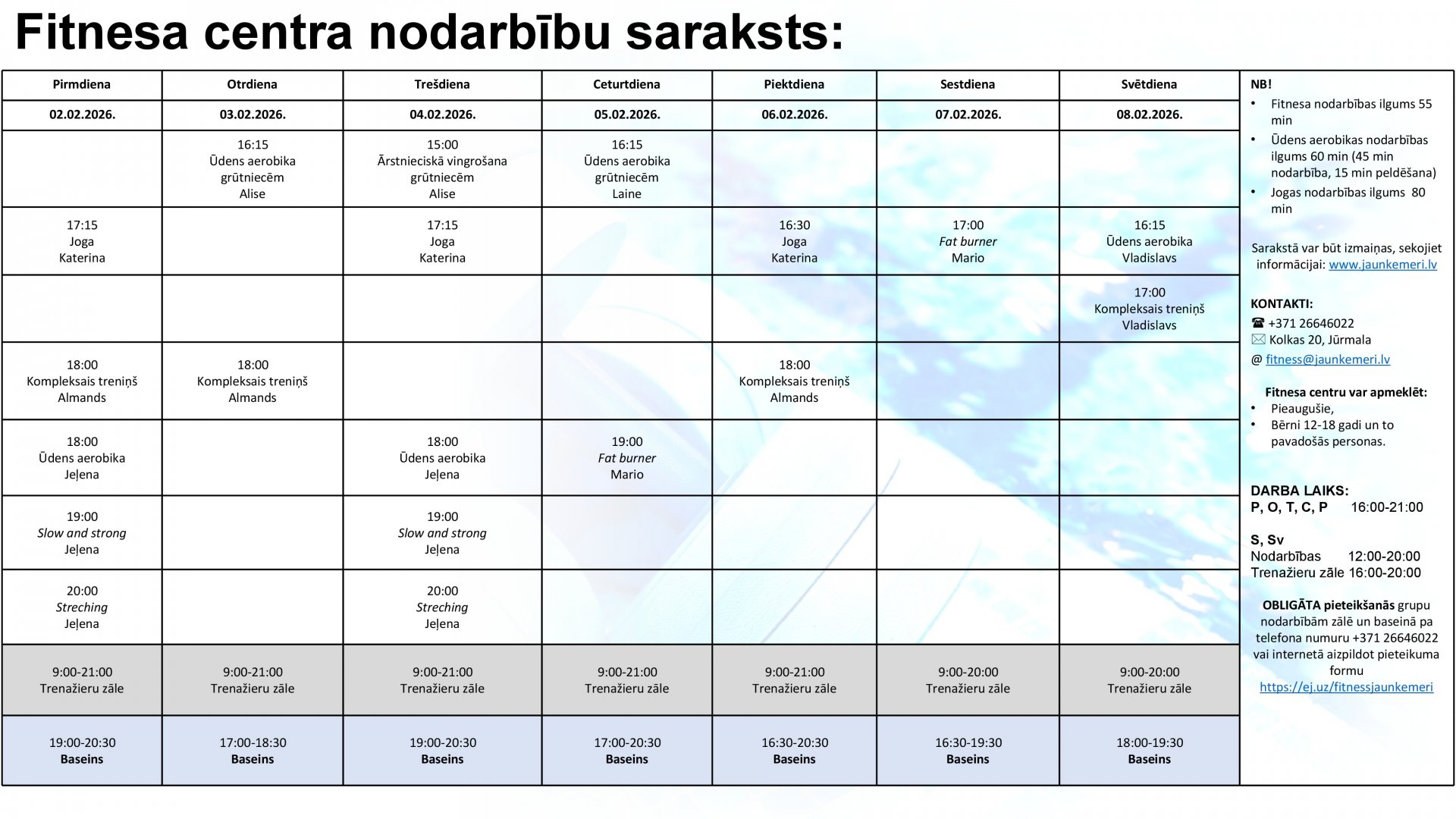 Uzmanību! Lai apmeklētu Fitnesa centra nodarbības, lūdzam aizpildīt pieteikšanās anketu internetā: https://ej.uz/fitnessjaunkemeri