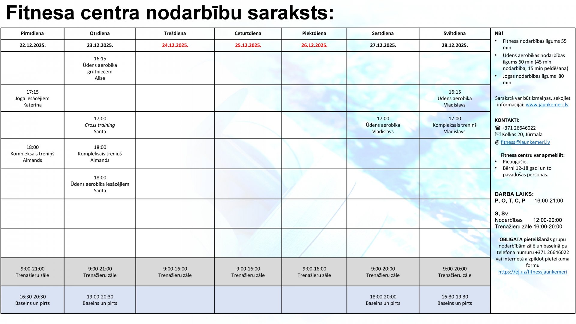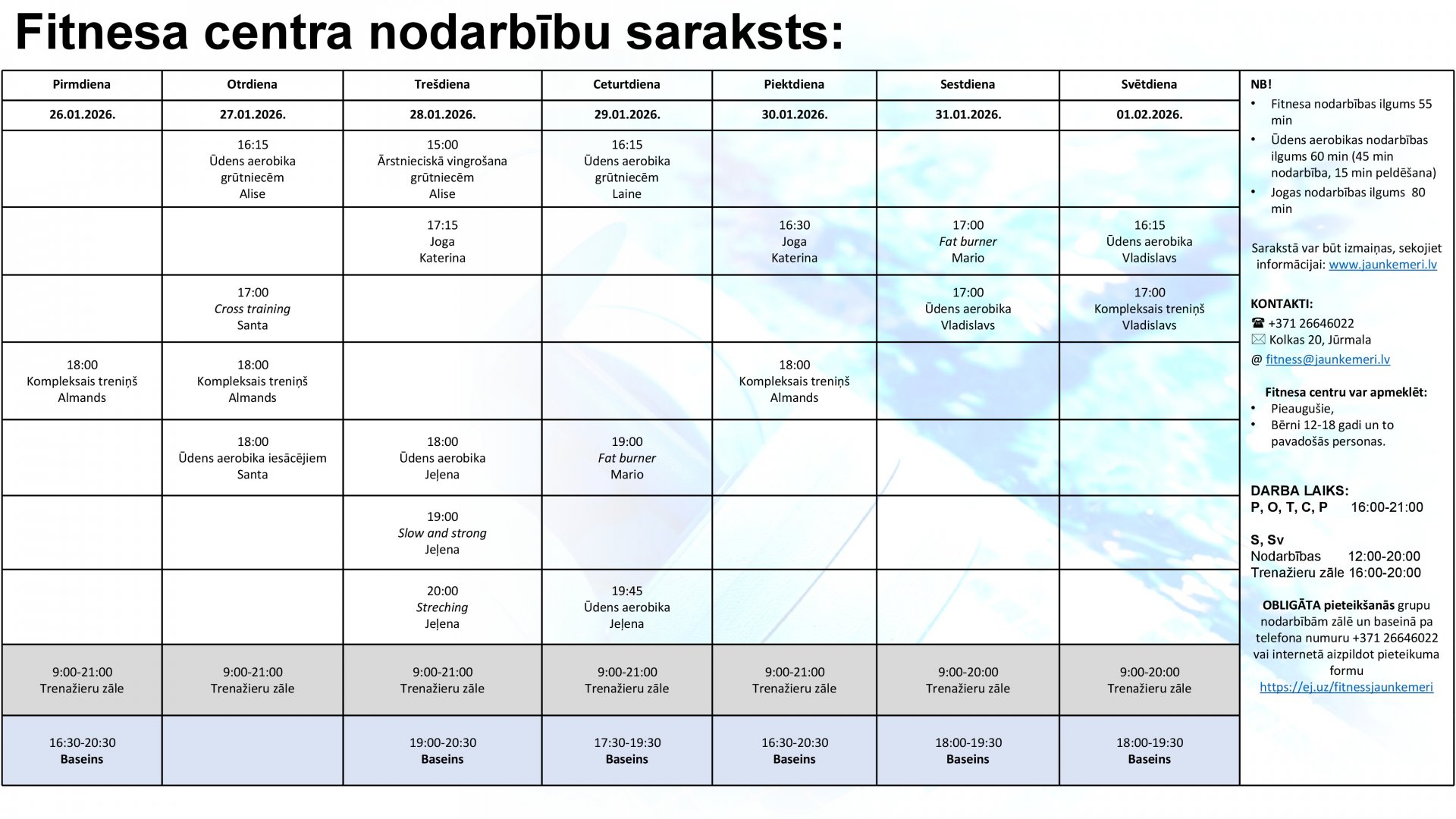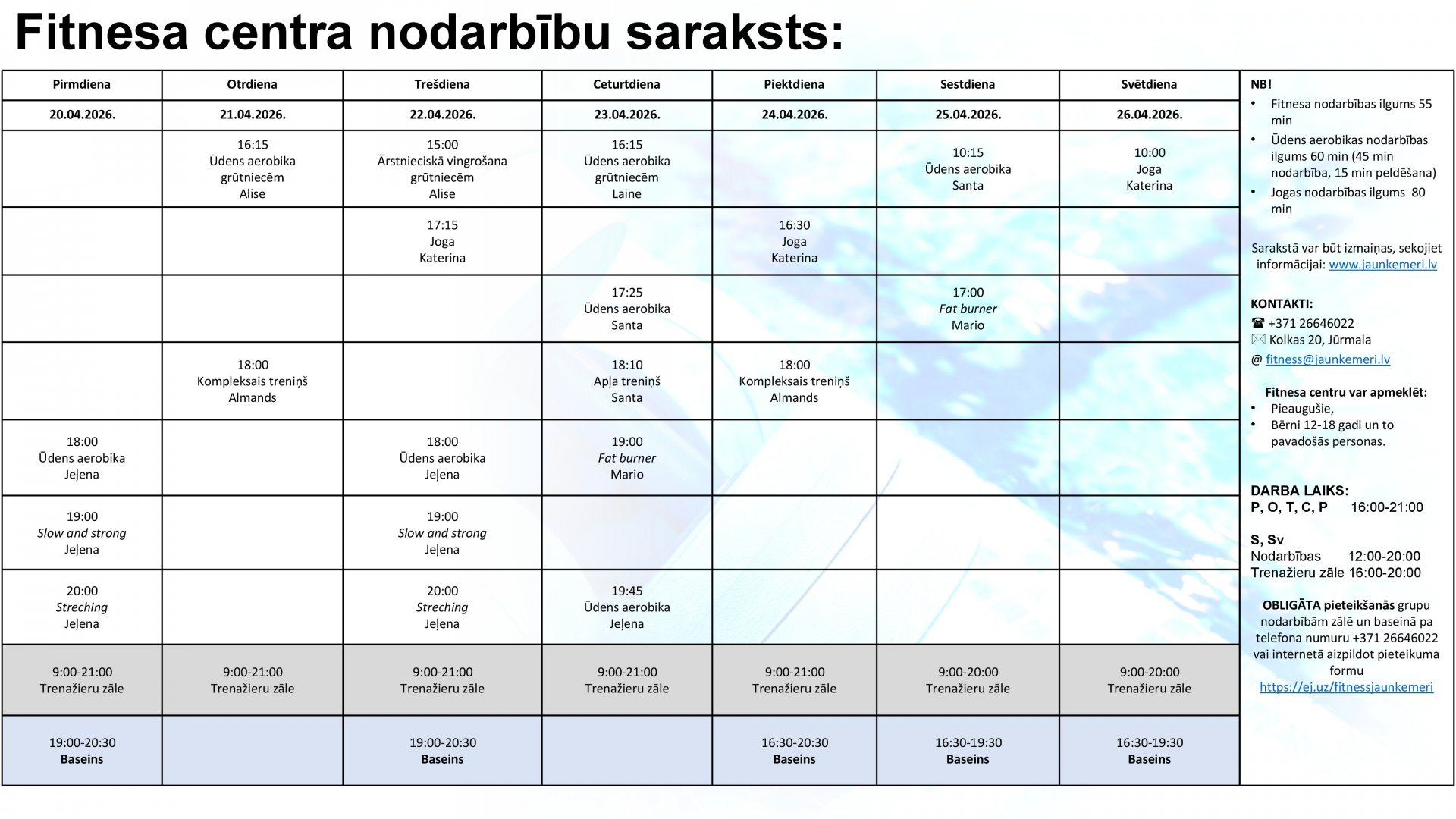 Uzmanību! Lai apmeklētu Fitnesa centra nodarbības, lūdzam aizpildīt pieteikšanās anketu internetā: https://ej.uz/fitnessjaunkemeri