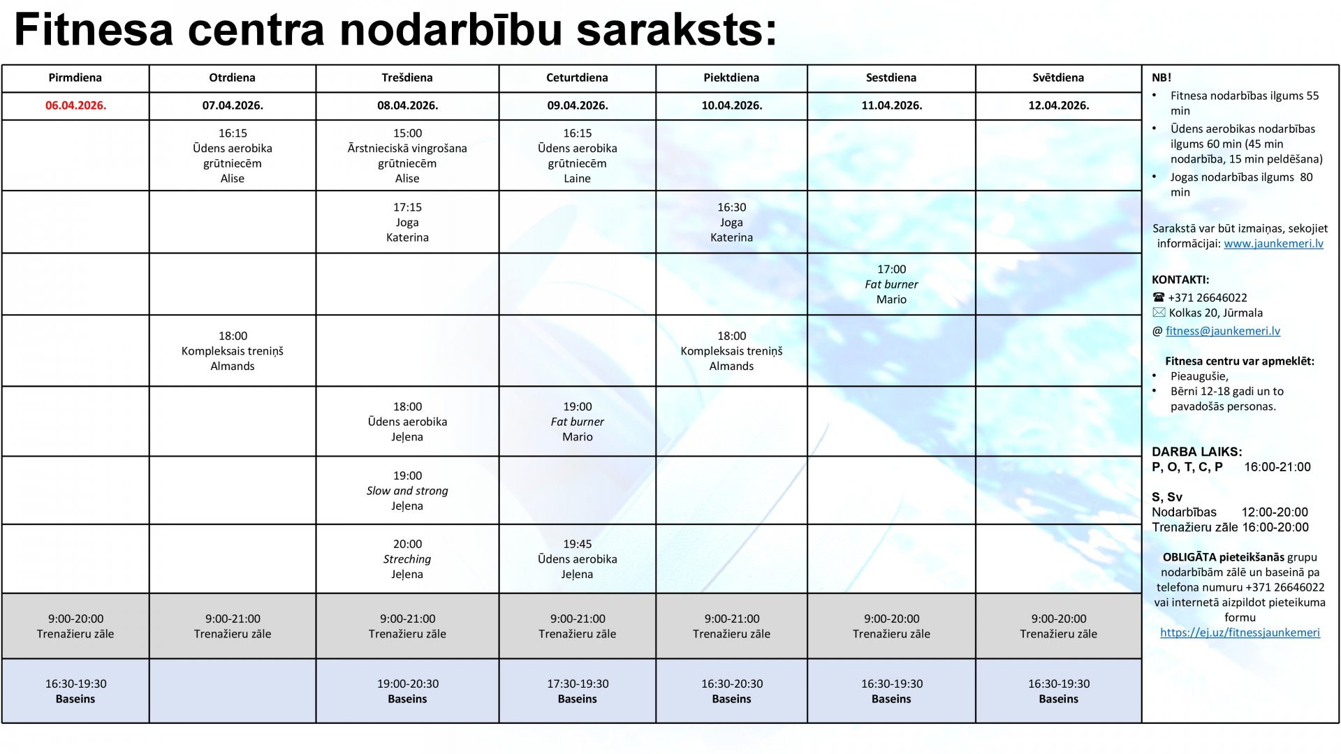 Uzmanību! Lai apmeklētu Fitnesa centra nodarbības, lūdzam aizpildīt pieteikšanās anketu internetā: https://ej.uz/fitnessjaunkemeri